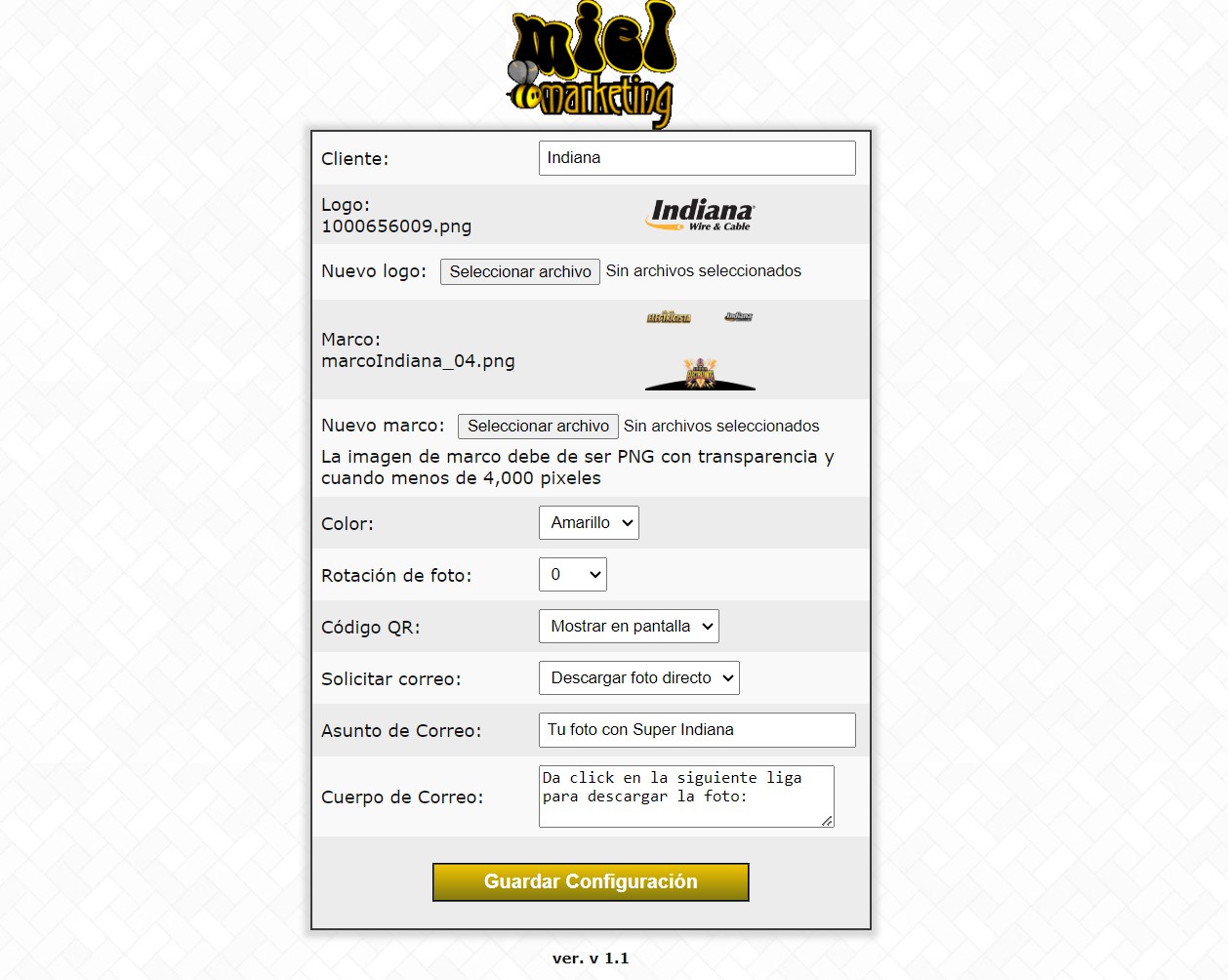 Página de configuración para subir logo, marco personalizado y cambiar las opciones de solicitud de correo, etc.